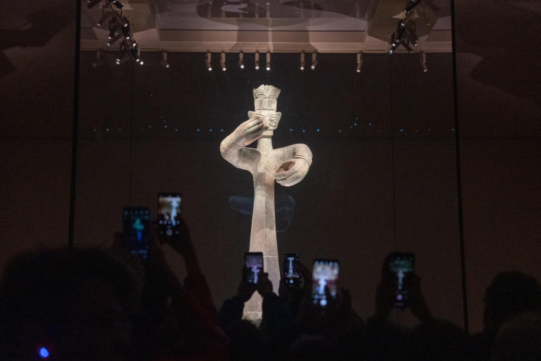 金器、玉器、铜器……三星堆的各类“看家藏品”一应俱全。本次展览中,三星堆博物馆特别选派37件(套)“顶流”文物进京,件件都是高光担当:自带神秘气场的商代青铜兽面具、造型奇绝的青铜龙柱形器,还有被网友戏称为“青铜健身教练”的青铜着裙立人像,亮相国博。