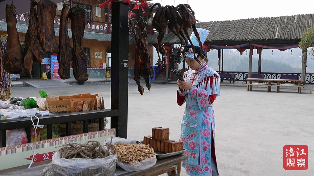 00后羌族姑娘陈新一站在镜子前换上艳丽的羌服,随后提着摄像设备走进村里一户羌家的腊肉炕房。灶台上,悬挂着一排排色泽红润的腊肉,阳光透过窗棂洒在腊肉上,透出诱人的光泽。她举起相机,一边调整角度,一边与正在熏肉的婆婆聊天。