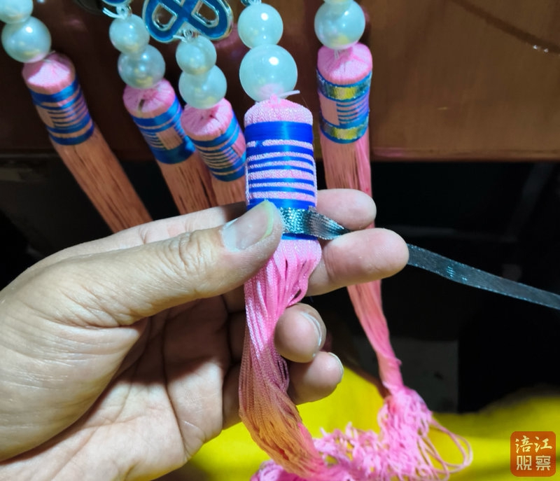 以他为川超啦啦队制作的蝴蝶盔为例,这顶融合了明末清初老样式与现代审美的盔头,制作工序多达四十多道:从刻板、上浆、挤粉,到点绸、扎冕旒、上珠串,每一步都马虎不得。盔顶是一只展翅欲飞的大蝴蝶,两侧是“双凤抢宝”,前后缀满绒球和流苏,仅冕旒就有17根,40余顶蝴蝶盔仅手做冕旒就将近800根。