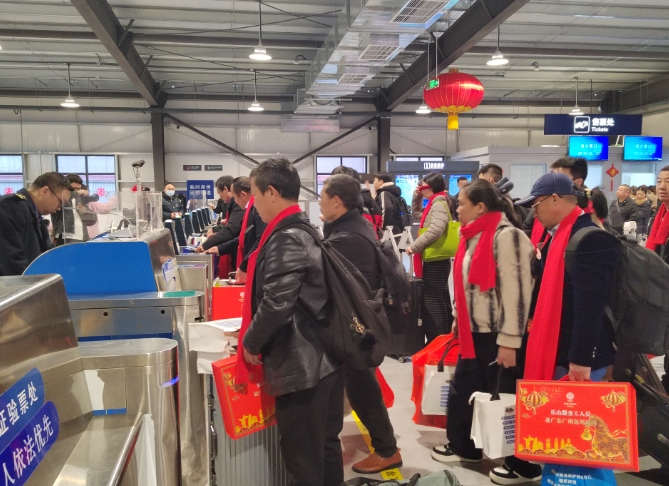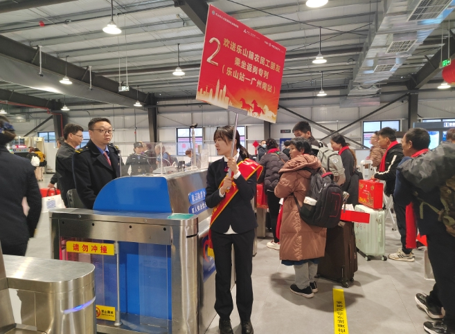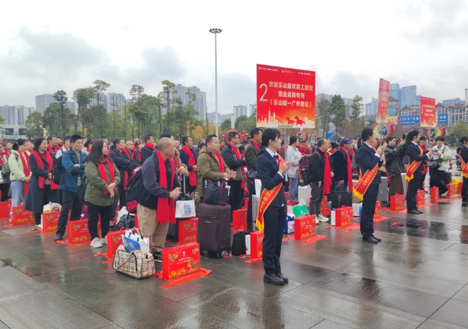 3月2日,由乐山市人力资源和社会保障局举办的“人社暖心,工友同行”乐山籍农民工免费返岗专列发车仪式,在高铁乐山站举行,来自市中区、井研县、犍为县的140名乐山籍务工人员统一搭乘D1809次列车,从乐山站出发,直达广州南站,踏上返岗复工之路。