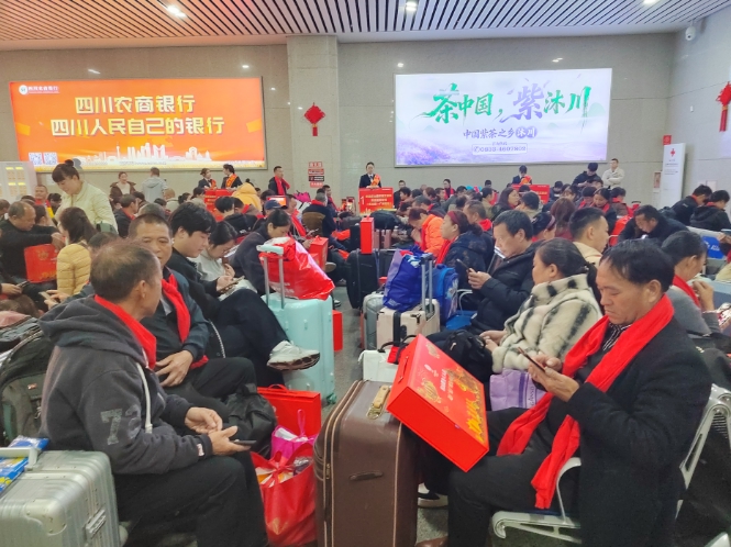 早上9点半,140名务工人员乘坐当地人社部门提供的包车来到高铁乐山站站前广场集合。工作人员随即将精心准备的140份礼品送到务工人员手中。在简短而暖心的发车仪式结束后,务工人员跟随工作人员脚步,在专属通道有序通过安检,来到专属候车区休息。