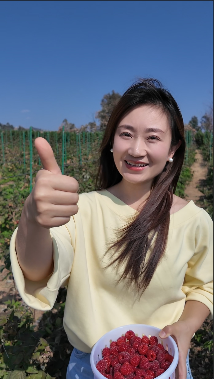 作为树莓种植园的运营负责人,娄娇站在地头,正在为电商客户拍摄短视频。“成都的、北京的,都催着要货。没办法,真不够分。”她晃了晃手机,笑得高兴,又透着点着急。