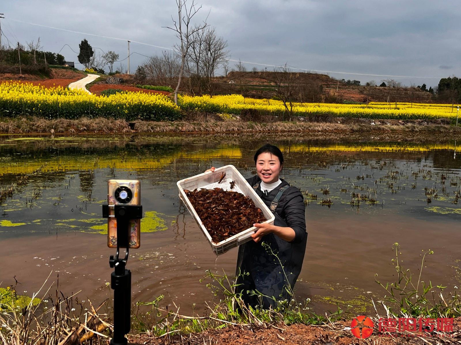 3月的黄鹿镇已有小龙虾可尝,5月开始将进入消费旺季。这个时节,李美常把直播间搬到虾塘边。“看这小虾苗好新鲜,两个月后就能上桌,宝子们快来宝塘村品虾!”水塘里,穿防水服的李美手捧虾苗,对着手机镜头笑容爽朗。水稻种植季,李美也常在田间直播,随手抓起水稻和网友唠家常:“这是我们宝塘村的稻虾米,稻虾共生不施化肥,煮出来的饭香喷喷。”
