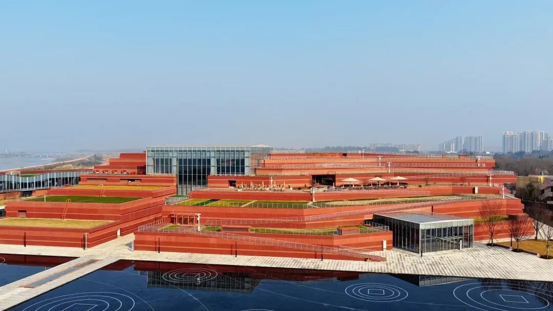 走近馆前,一汪镜面水池将整座建筑倒映其中,外立面复刻遗址河道基岩的红砂岩色彩与肌理,层层叠叠的“地质分层”效果艺术化再现“沉银出水”的历史瞬间。