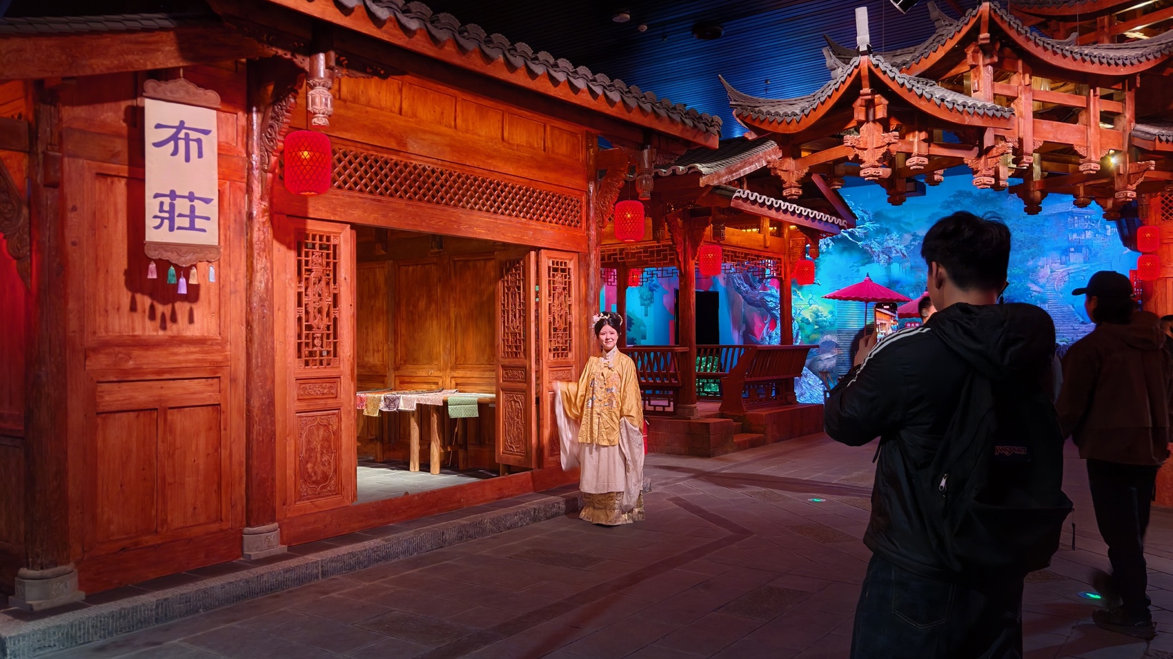 从“溢彩华韵”展区步入,明代服饰文化的华美画卷徐徐展开。精美的金银首饰、玲珑纽扣、带銙佩饰,让人仿佛穿越回那个衣必求贵、绮罗轻裘的时代。而在毗邻的明代商品贸易集市体验区,游客们正饶有兴致地与“NPC”货郎互动,或询问蜀锦市价,或品鉴茶叶冲泡技巧,欢笑声不绝于耳。