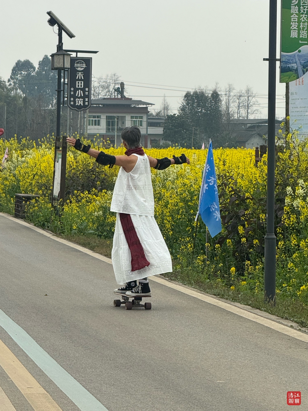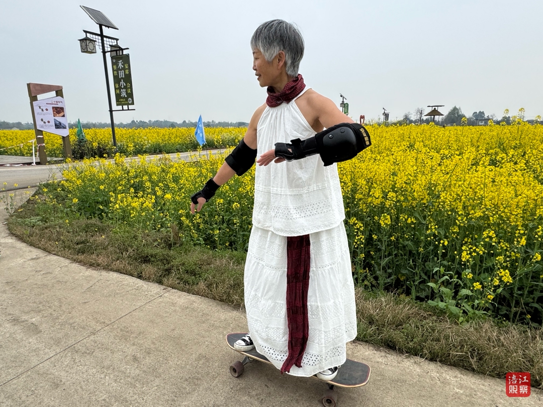 看到钱奶奶玩滑板,在油菜花田拍照打卡的游客杨萍和同伴们赞叹之余,也道出了中老年人的心声:“我们要和年轻人与时俱进,不能窝在家里,出门看看大自然,追求精彩世界。”