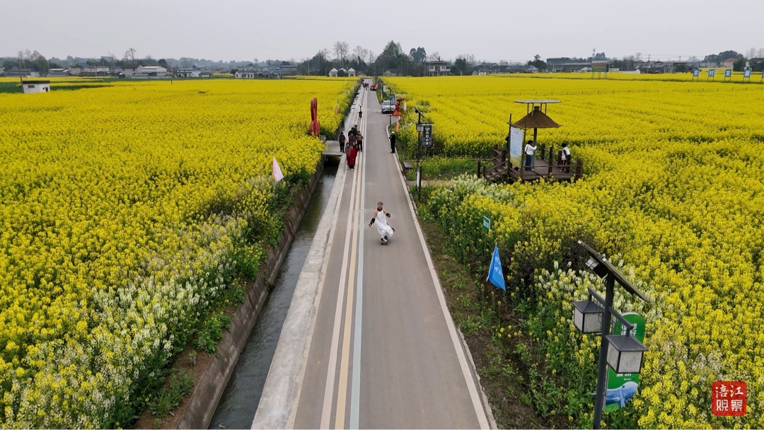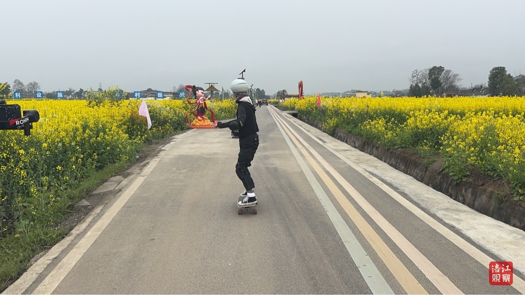 钱立群在教练羊辉的指导下反复练习陆地冲浪滑板动作中难度较大的“仙女跳”。春日阳光下,安州的油菜花海不仅是游客的打卡地,也成了钱立群的“活力教室”。她如同一只自由飞翔的鸟儿,徜徉在大自然的怀抱里尽情放飞自我。
