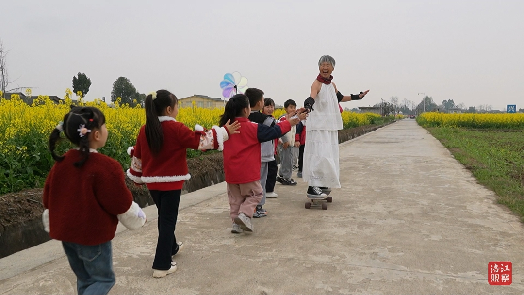 “谁家奶奶还玩滑板呀?”路遇一群在油菜花田里春游的幼儿园小朋友,孩子们睁大眼睛好奇发问。钱立群故意轻轻一蹬,滑板带着裙摆滑出半米,逗得孩子们拍着手欢呼:“奶奶好厉害!”
