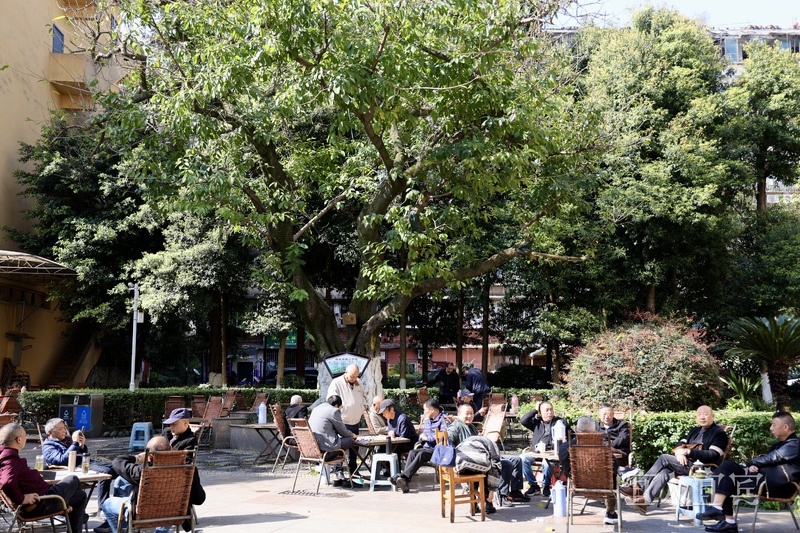众多古树,就生长在寻常街巷、百姓身边。翠屏区工人文化宫内,在121岁的黄葛树下,市民们在浓荫的庇护下喝茶、下棋、聊天,市井烟火气安然流淌……