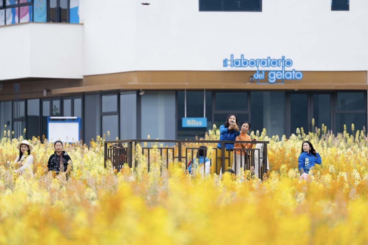 走进临空经济区仁里村,DNβ资阳数字游民社区近未来中心门前,17亩彩色油菜花开得正盛。粉的似霞、橘的如焰,五种色彩交织铺开,微风拂过,花浪翻涌。站在田埂上远眺,花海与白色建筑相映,恍惚间竟有几分“莫奈花园”的意境。