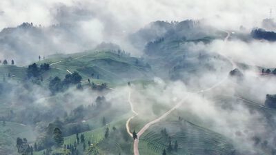 再加上航拍绝佳机位,完美还原茶垄层叠韵律,清晨侧光强化明暗对比,雾滴漫反射柔化画面质感,每一个细节都踩在审美点上,想不火都难!