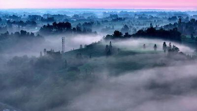 想要拍出同款仙境,得卡准精准气象条件:前一晚雨水润透大地,次日清晨无风升温,低空水汽顺着地势抬升凝结,形成轻薄平缓的平流雾,像轻纱一样均匀铺在茶垄间,自带柔焦磨皮效果。再加上春日低角度朝霞,暖金光穿透雾滴发生散射,把白雾染成鎏金,和翠绿茶园形成绝美撞色,完美复刻《千里江山图》的青绿赭石渐变,这可是光学散射+气象条件联手打造的视觉奇迹~