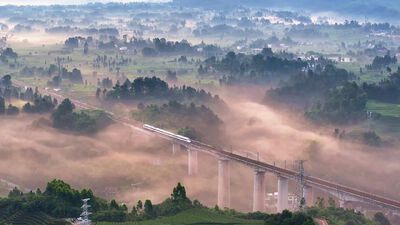 高铁穿行平流雾漫的茶园