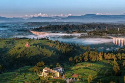 成雅铁路顺着山势修建,高架桥墩隐在茶山深处,动车如同银龙穿梭其间,一边是传承千年的青绿茶山,满是田园诗意;一边是疾驰飞驰的现代列车,尽显时代速度,动静结合、古今交融,彻底打破了静态田园的单调。