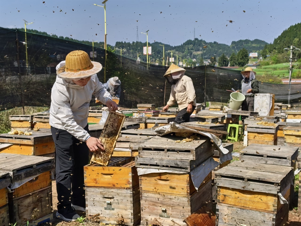 安传远和安岳本地村民正在蜂场里忙碌。