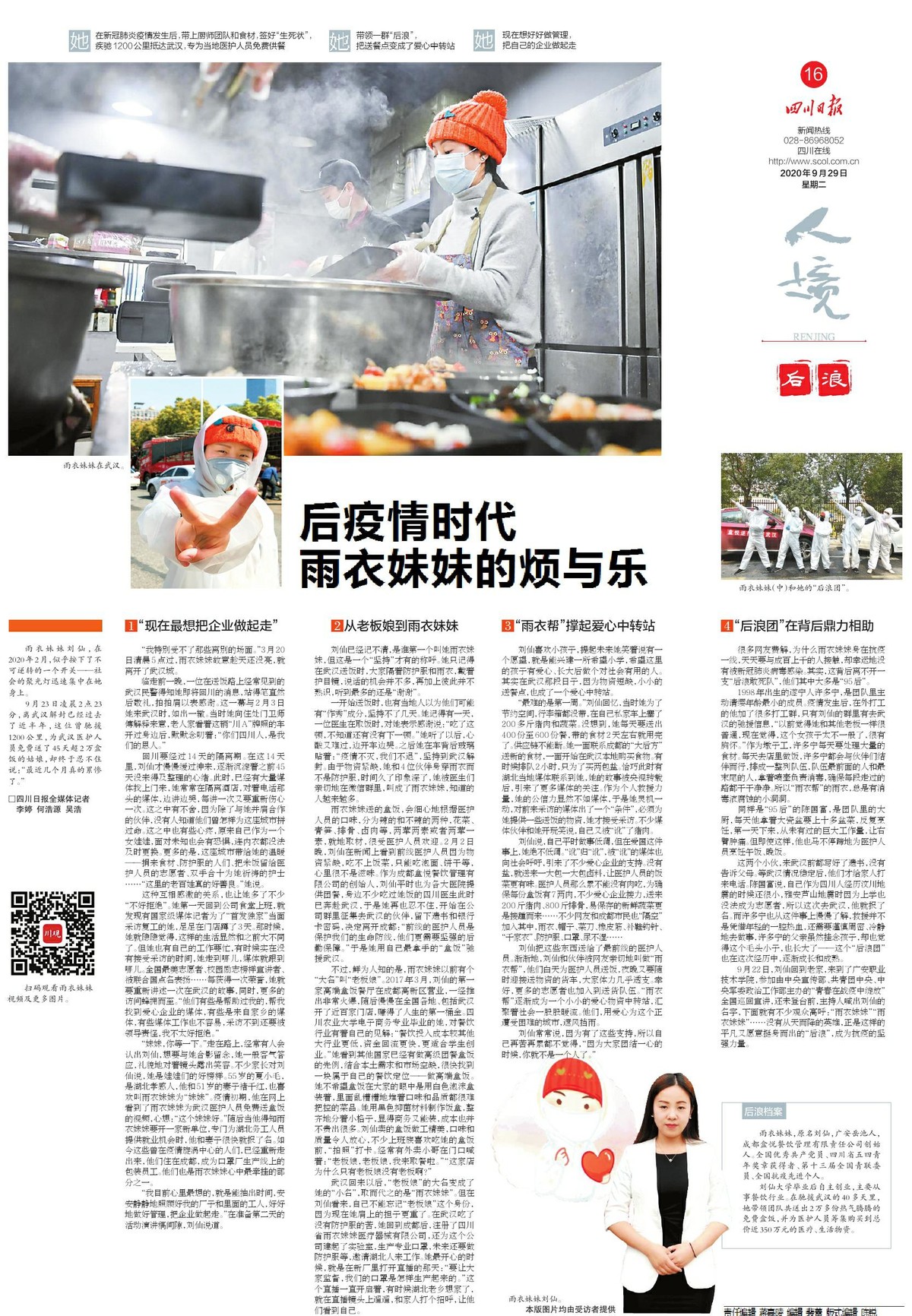 雨衣妹妹,原名刘仙,广安岳池人,成都盒悦餐饮管理有限责任公司创始人。全国优秀共产党员、四川省五四青年奖章获得者、第十三届全国青联委员、全国抗疫先进个人。