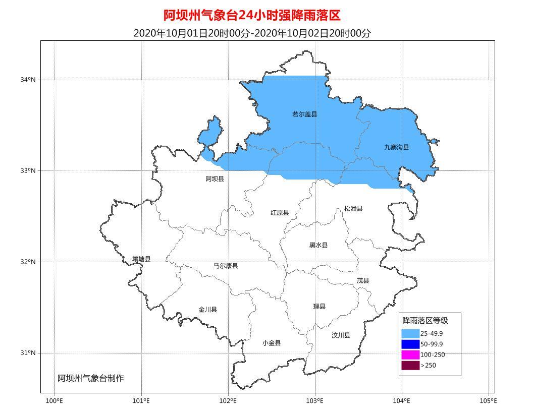 1日20时到2日20时,受高原切变和地面冷空气共同影响,阿坝州大部阴天间多云有小雨到中雨,北部部分地方有大雨,其中若尔盖县、九寨沟县、阿坝县北部、红原县北部和松潘县北部部分乡镇有暴雨(25-40毫米),过程来临时将伴有雷电、短时强降水和阵性大风等强对流天气,请做好防范。