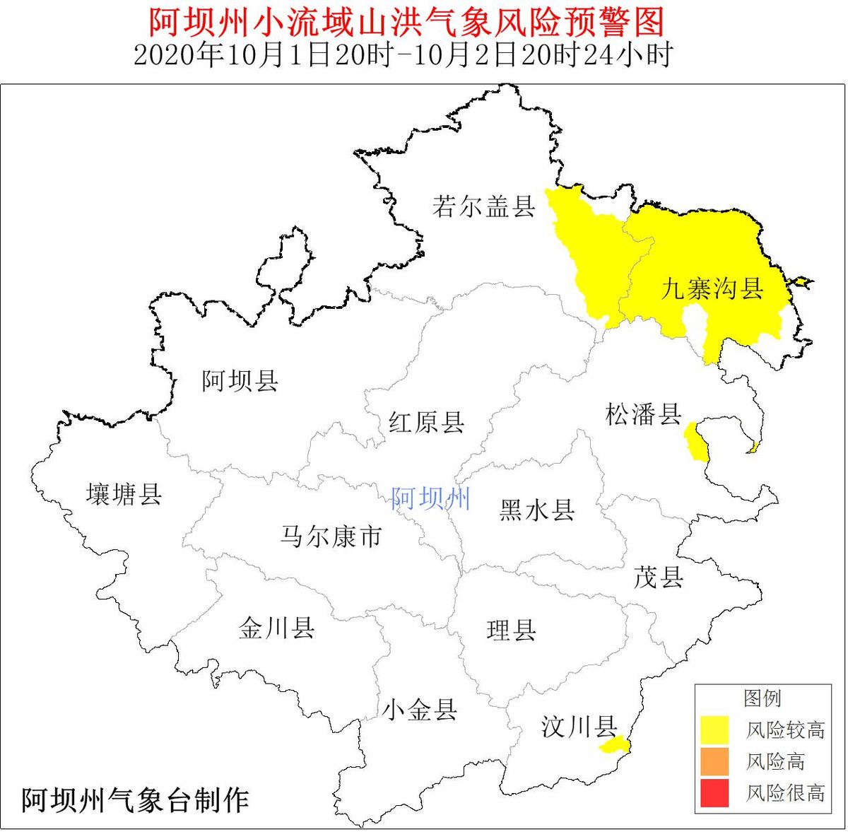1日20时-2日20时24小时,汶川县、松潘县、九寨沟县、若尔盖县等4县发生山洪灾害气象风险等级较高。