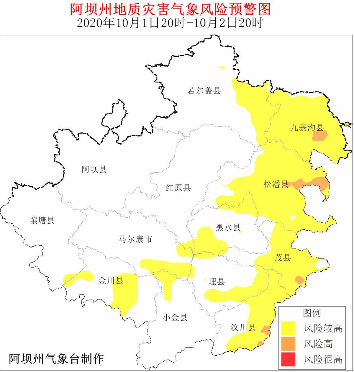 1日20时-2日20时,汶川县、理县、茂县、松潘县、九寨沟县、金川县、小金县、黑水县、壤塘县、若尔盖县、红原县、马尔康市等12县(市)发生地质灾害气象风险等级较高,其中汶川县、茂县、松潘县、九寨沟县的部分地方发生地质灾害气象风险等级高,请注意预防。