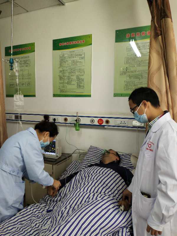 1小时后,120急救人员将病人送入香格里拉镇卫生院,立即进行重症监护,医疗监测为浅昏迷状, 血氧饱和度50%,呼吸40次/分,心率108次/分,血压140/110mmHg,双肺满布湿罗音,是一例严重的急性高原肺水肿,病情可能随时恶化危及生命。