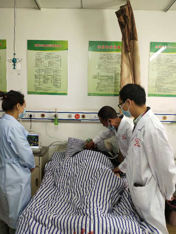 30分钟后,医护人员到达现场,看到病人在景区简单供氧急救下,仍然神志不清、嘴唇发紫,靳太玲立即为患者氧气吸入、心电监护、建立静脉通道。周小平通过叩诊,初步判定该游客为“感冒+严重高原缺氧”造成急性高原肺水肿。