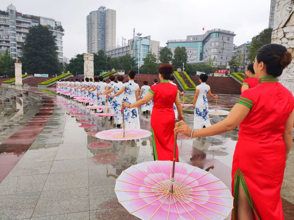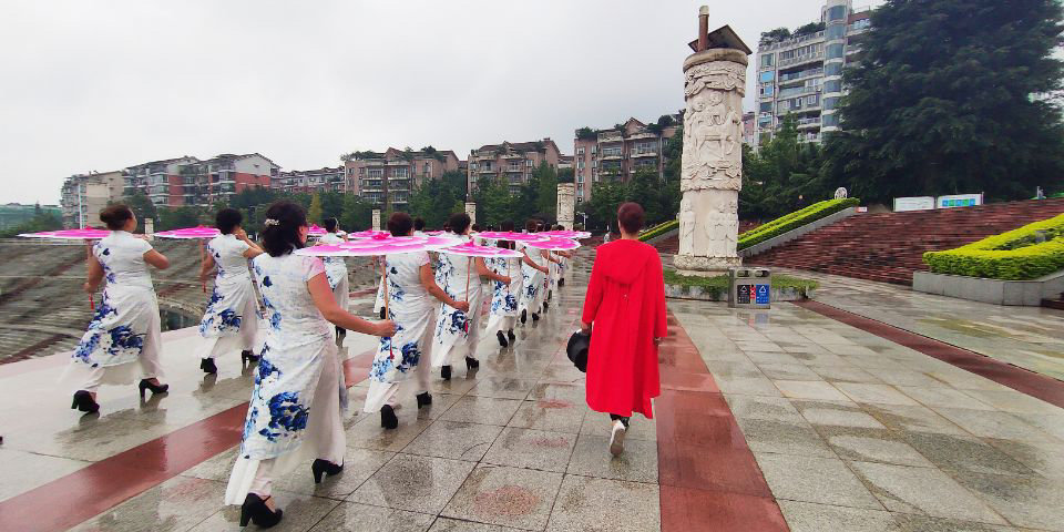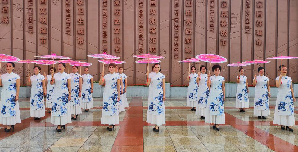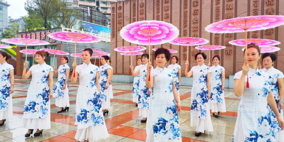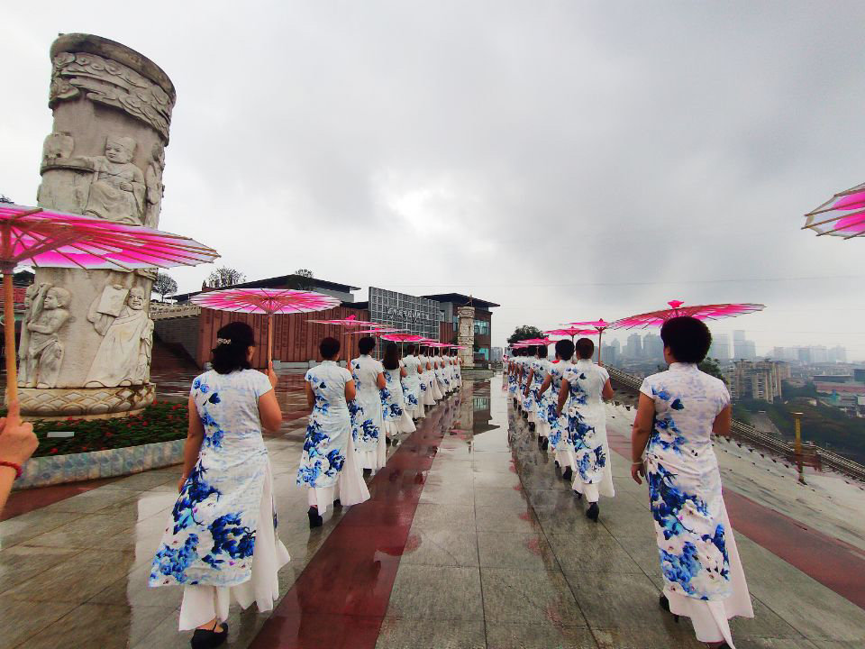 早在9月29日,伟伟走秀队在泸州百子图广场排练节目了。早上9点,泸州下了一夜的雨刚停不久,天空还布着乌云,天气带着秋天的凉意。伟伟走秀队近40位身着青花瓷花纹旗袍的成员伴着古典音乐,正在进行日常的训练和参赛节目排练。十公分的高跟鞋踏过积水,秋风带着她们的裙摆在空中翻飞。她们优雅的模特步和轻盈的体态、如兰的气质,吸引了不少晨练的市民围观。