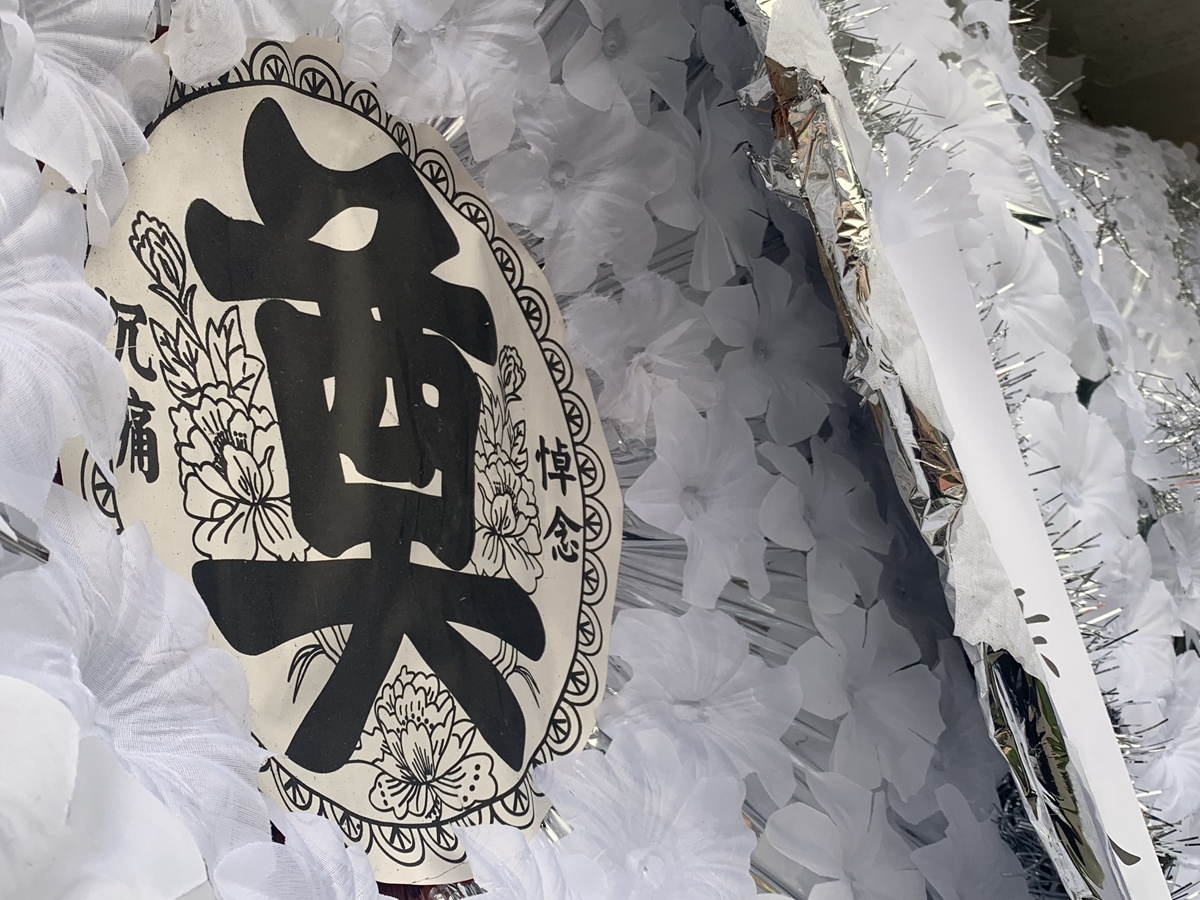 绢花朵朵寄哀思,泪光闪闪送英灵。送别仪式现场庄严肃穆,“因公牺牲民警李雨阗同志送别仪式”的黑底白字横幅悬挂在大厅正上方,会场两侧的挽幛上写着“永垂不朽,精神长存”寄托哀思,8名身着制服的警察肃立,护卫着战友的英灵。灵堂内外摆放着领导、同事、好友、社会各界群众送来的花圈、花篮。