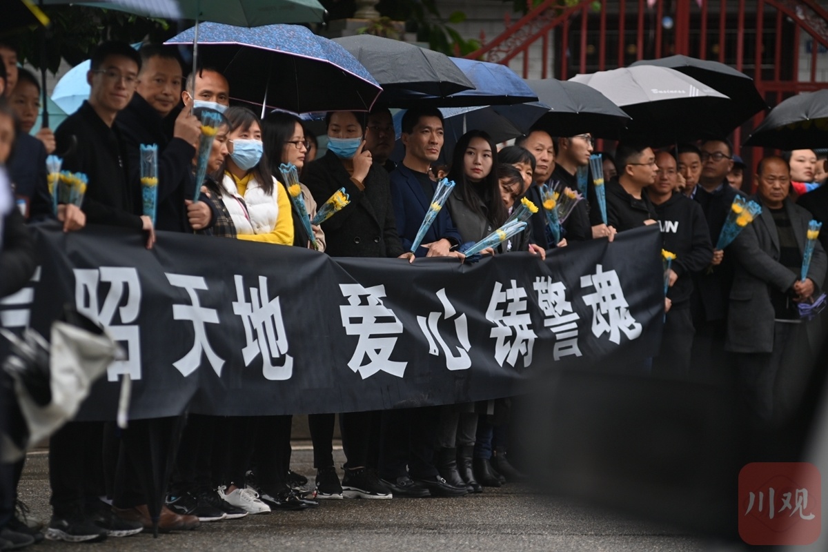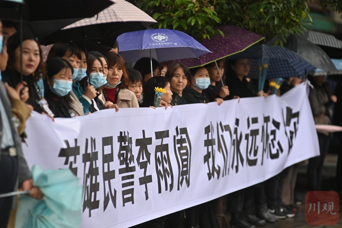 滚滚嘉陵皆是泪,默默苍山尽含悲。10时30分左右,载着李雨阗灵柩的灵车在警车护卫下,沿着北门大道、人民中路、兴贤街、滨江路、东城派出所等路段缓缓前行,在英雄牺牲的梨乡故土,李雨阗的生前战友拉着“忠诚践誓言、浩气贯长虹”“战友李雨阗,一路走好”等横幅,泣不成声送别亲爱的战友最后一程。自发前来为英雄送别的群众在李雨阗灵车经过的道路两侧肃穆站立,他们胸带白花,或眼含热泪、或相拥而泣,依依送别梨乡英雄。现场汽笛长鸣,哭声阵阵,汇聚起了无尽悲伤。