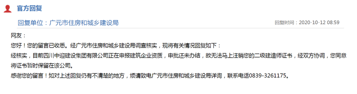 而对于网友所关心的广元市住建局是否有违规行为的问题,该负责人则表示,不存在这样的情况,他们在收到程先生的投诉后就立即停止了四川中迎建设集团有限公司的建筑企业资质审批工作,并且最后也未予同意通过。证书暂时保留在该企业则是由于证书注销前需要双方结清利益往来,并经双方认定不存在经济纠纷,而完成这项工作尚需一定的时间。