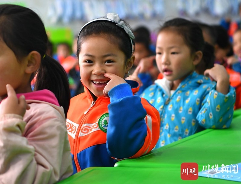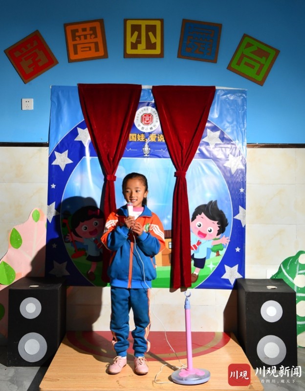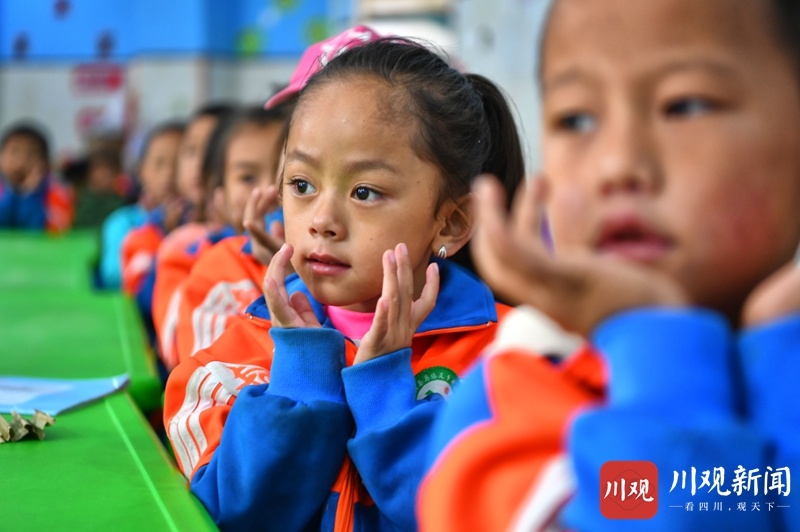 10月26日,凉山州金阳县马依足乡东山社区幼教点苹果班里传出阵阵优美的歌声,全班40多名小朋友在老师的带领下一起唱起了歌曲。随后,在教室前面设立的学普小舞台上,6岁俄则徐英上台给同学们唱了一首《刷牙歌》,在老师和同学们的掌声中,她露出了天真的笑容。