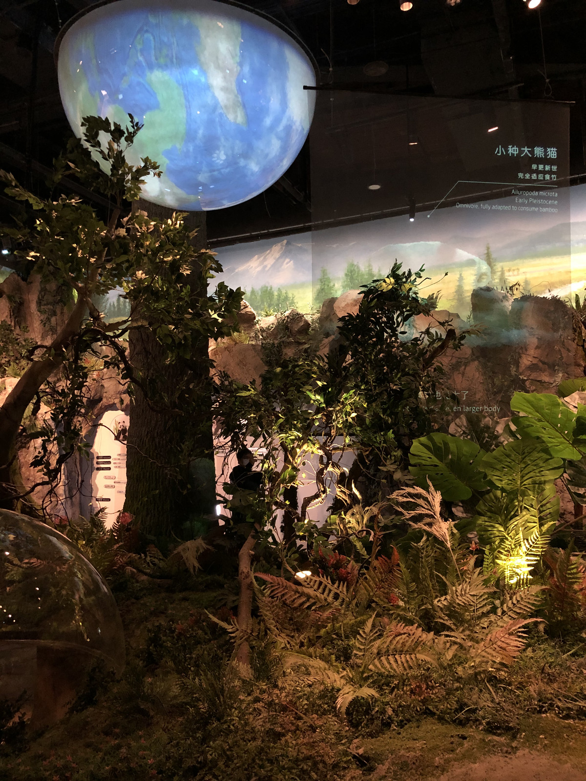 顺右手边楼梯拾阶而上,二楼就是博物馆的穹幕影院和3D影院。值得一提的是,穹幕影院占据了一整个影厅的屋顶,影院内没有设置座椅,游客在其中或坐、或躺、或倚的观赏“飞跃熊猫谷”等球幕影片,领略大熊猫自然栖息地的生态面貌和大熊猫生活状况。