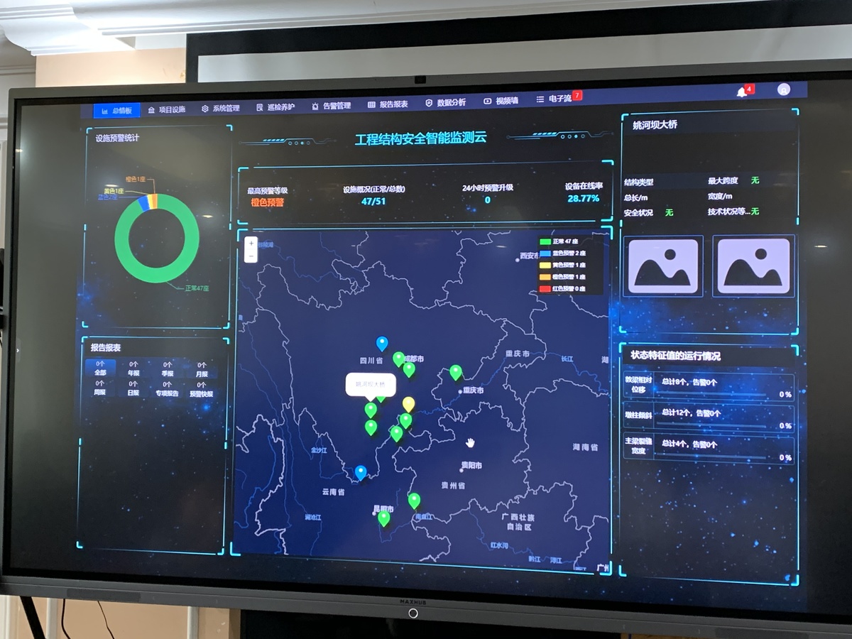 在位于成都的办公室,吴涤点开他们开发的“工程结构安全智能监测云”,通过这个云平台,可以“看”到数百公里之外的雅西高速姚河坝大桥。移动鼠标,点击大桥图案及周边的不同位置,相应数据即跳了出来。“这是边坡的情况,这是桥梁的相关数据……”他边操作边说,这些数据来自布设在现场的监控设备,反映的是实时状况。