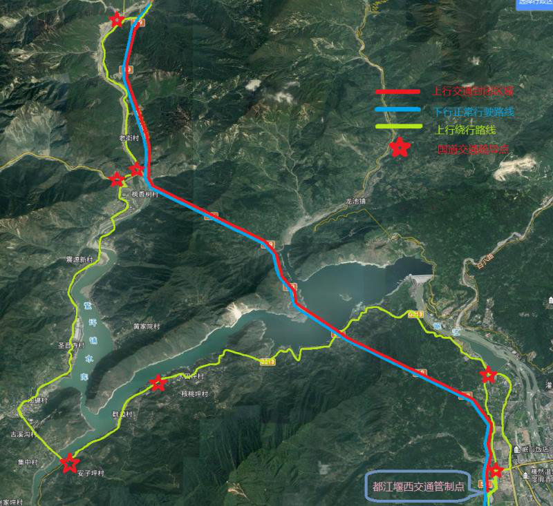 绕行线路如下:都江堰至汶川方向的车辆在都江堰西收费站下站,经国道213线紫坪铺绕坝路通行至汶川;汶川至都江堰方向(成都方向)的车辆经都汶高速通行至都江堰(成都)。