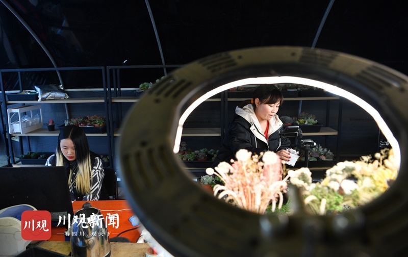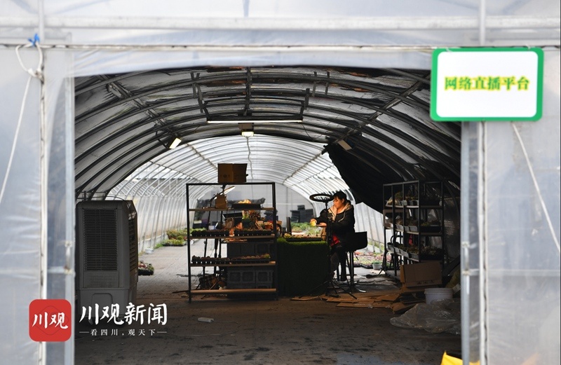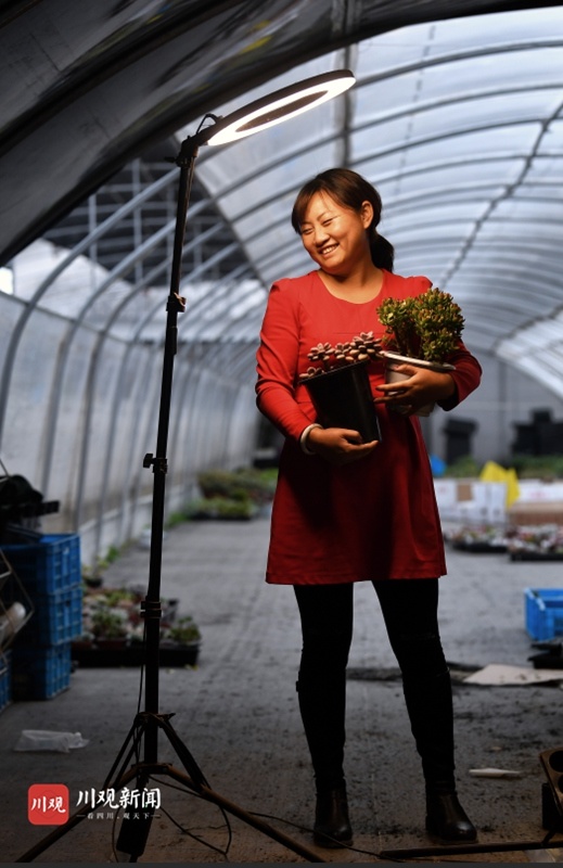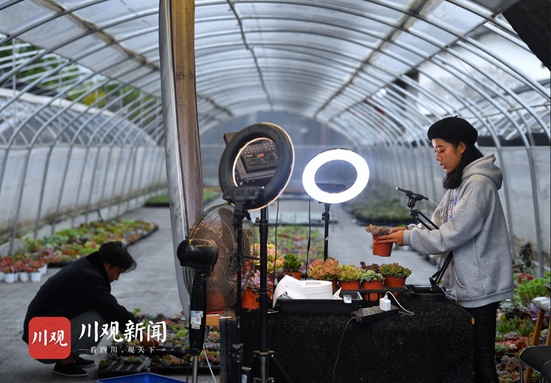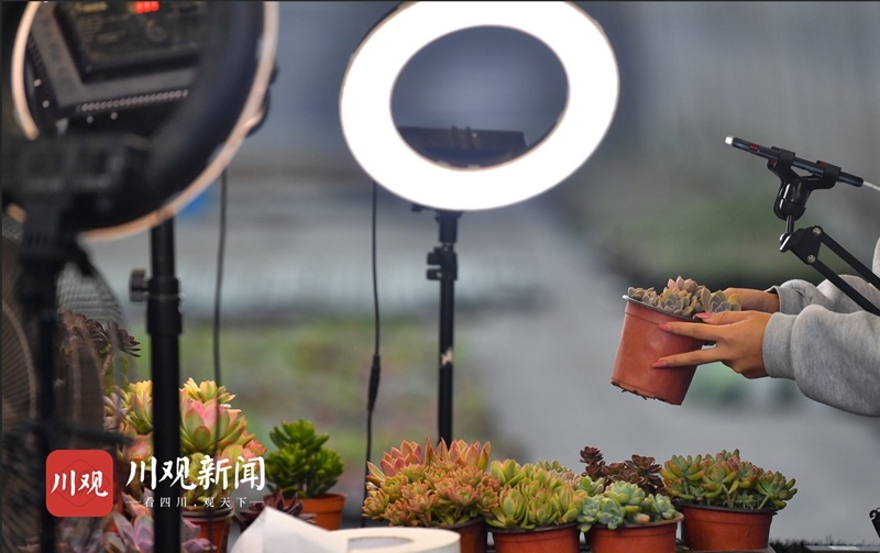 11月4日,西昌市礼州镇,西昌现代花卉产业园区大棚内,镁光灯下,李香雪正在做直播,展播台上整齐的摆放着鳞次栉比的多肉植物。