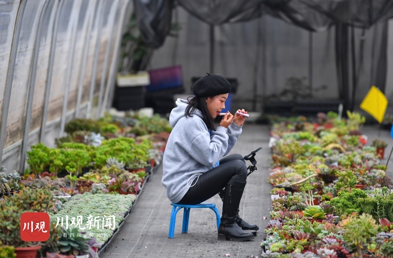 “这是双十一的特别优惠价格,谢女士下单了,这盆编号050的‘果冻乙女心’马上打包,请问还看上了其他的吗?还有063的‘吉娃娃’,好的马上打包。”她熟练的介绍着每盆多肉植物的特点,不时地和直播间的粉丝互动,这天要直播超过10小时,因为双十一销售旺季到了。