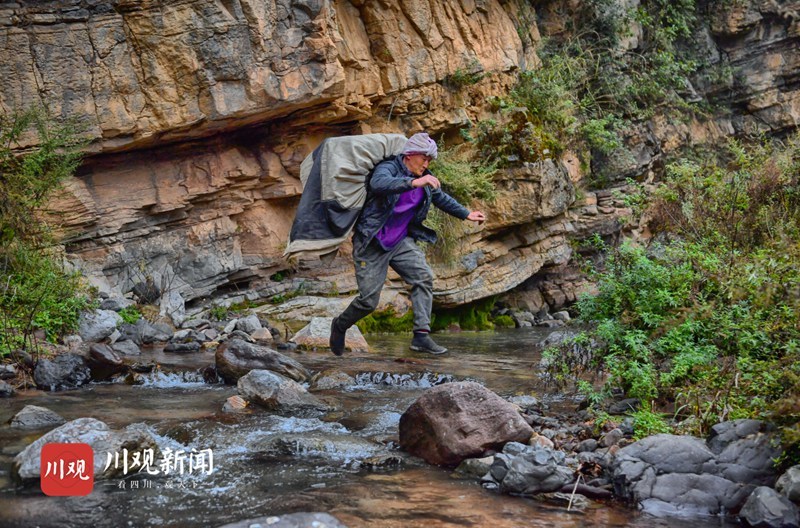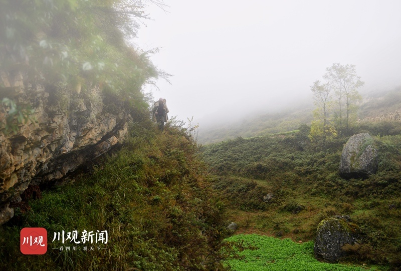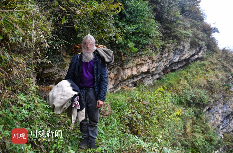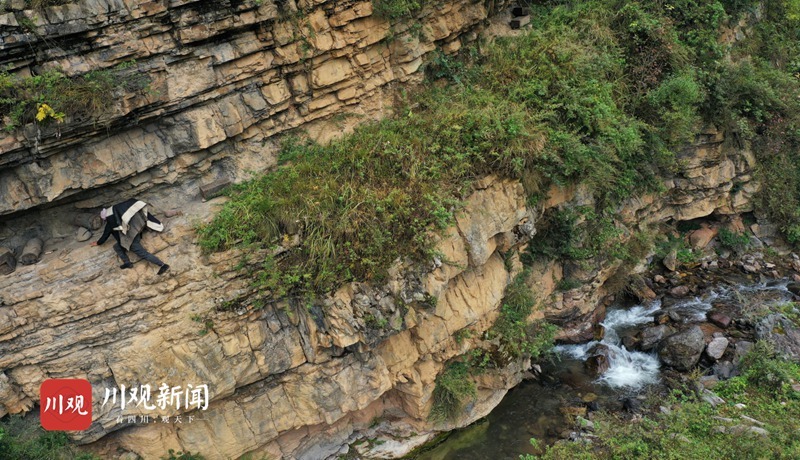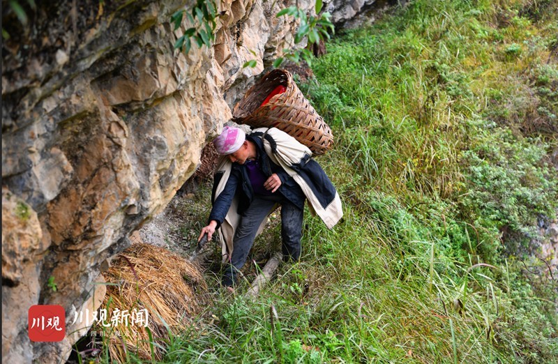 11月5日,凉山州美姑县瓦古乡瓦以村,吉克石者背负着背篓在悬崖攀行,他行动敏捷走过高约50多米的山脊,来到崖壁上养蜂的地点,今天他要取出新鲜的蜂蜜。