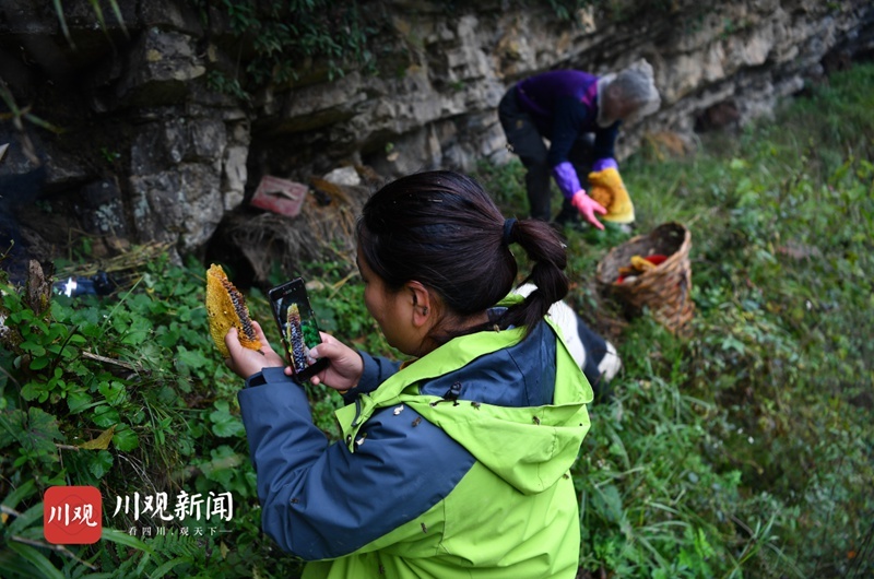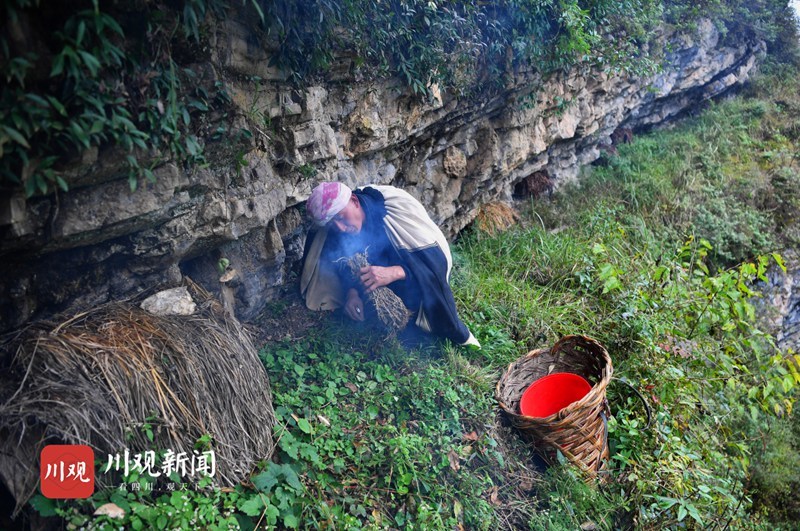 但在海拔2000米以上的大山中养蜂不是易事,方圆的森林中,只要有山崖的地方,野花多的地方,他就背着用树桩做的蜂桶走山路安放,更多的地方是无人区只能自己找路上山。安放好后,阿龙再在蜂桶里涂上蜂蜜,用这种原始的方式吸引蜜蜂前来安营扎寨。等到每年深秋的收获季节,吉克石者们就上山取蜂蜜了。