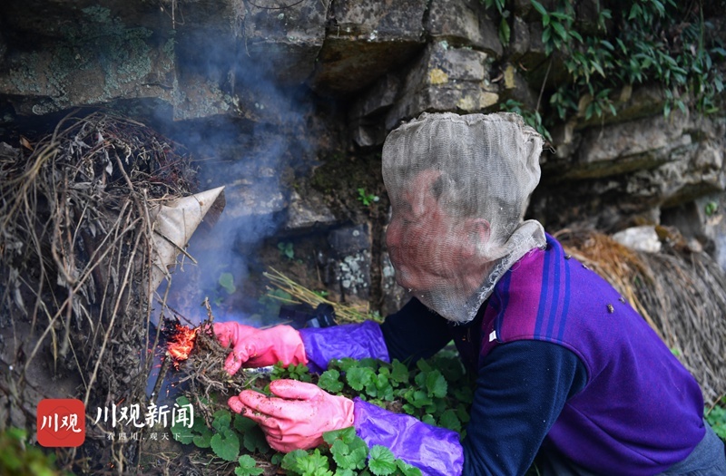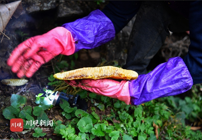 取蜂蜜的时候来了,在山脊上的吉克石者戴上头套和手套来到蜂箱前,他先用点燃枯草,用烟暂时熏走制蜜的蜜蜂,然后打开用泥土封口的蜂箱,小心翼翼的摘出一个蜂巢,拿出的瞬间蜂蜜已经流满手上。他尝了一口蜂蜜,“今年的蜂蜜又香又甜。”约莫半小时,吉克石者就将蜂蜜取完,准备装瓶后发往外地。
