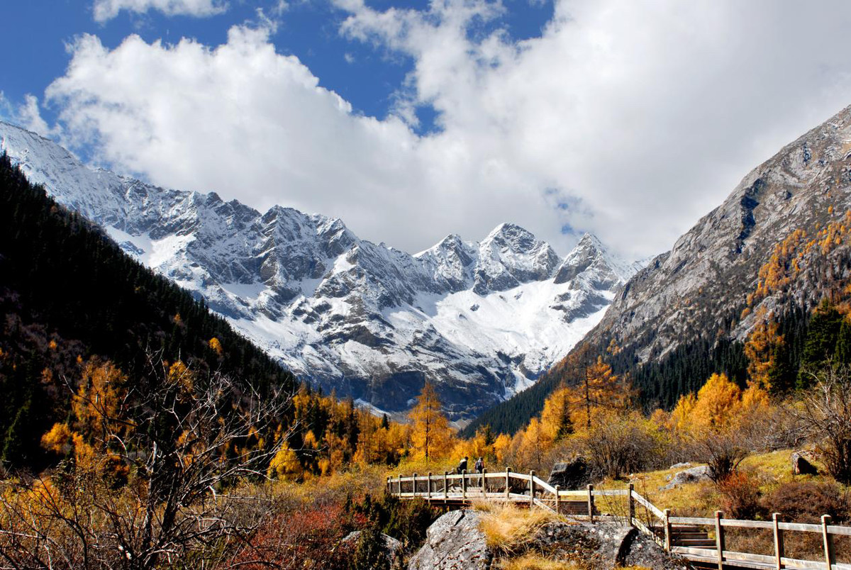 五彩如泼墨,七色抹脂胭,这是达古冰川景区深秋的写照。