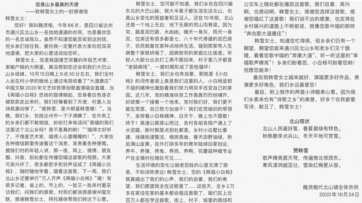 11月12日中午,知名演员、歌手韩雪通过微博晒出“给四川省达州市通川区北山镇乡亲们的回信”:“说实话,接到这封信时,我有些受宠若惊,没想到自己演唱的一首《再唱小白杨》得到乡亲们这么大的认可和万分喜爱,我也想用一封信来和乡亲们说说心里话.....”