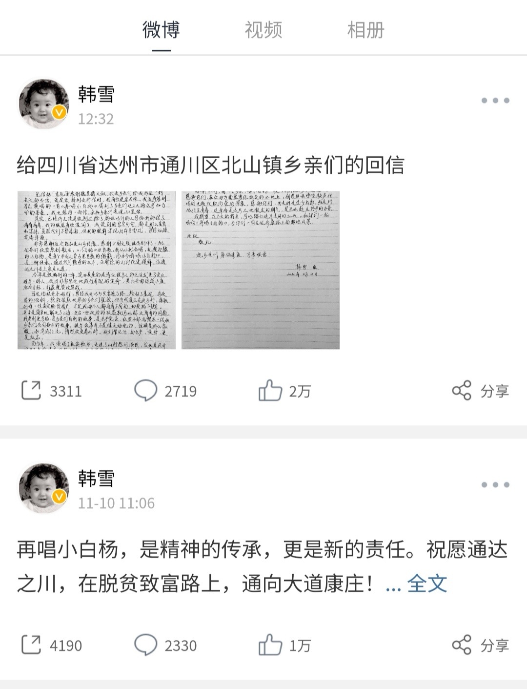 两天后(12日),韩雪再次在其官微上贴出“给四川省达州市通川区北山镇乡亲们的回信”,附上两张手写的纸质书信照片。