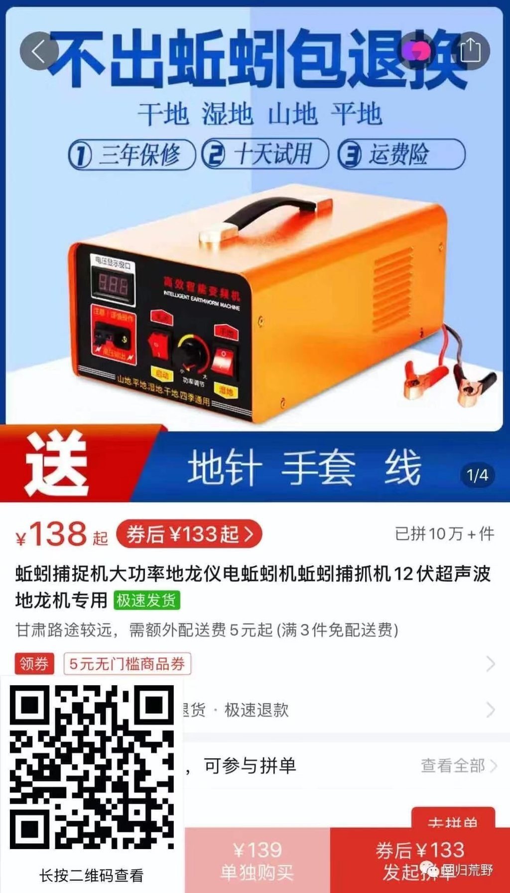 记者了解到,捕获的蚯蚓主要用来制作中药“地龙”,网络平台电商在出售电蚯蚓机的同时还兼顾回收“地龙”。此外,不少钓鱼爱好者购买电蚯蚓机诱捕野生蚯蚓作为饵料。