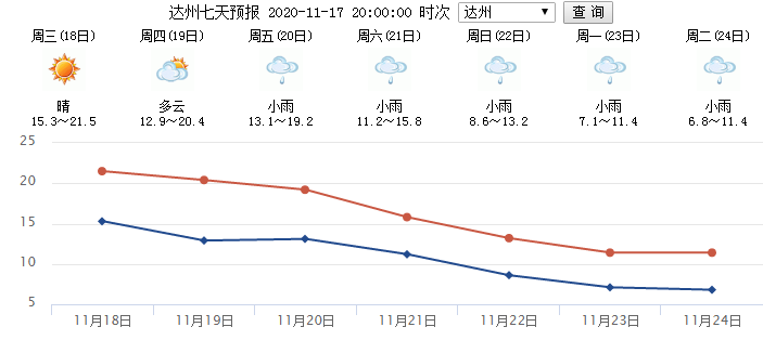 11月17日下午,达州市气象台发布强降温蓝色预警: