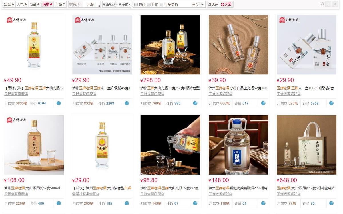 记者查询玉蝉老酒天猫、京东旗舰店发现,销量最好的是每瓶售价仅为49.9的玉蝉光瓶大曲52度,月销量达3833笔。而售价589元/瓶的酒城明珠10年52度、售价 678元/瓶的红福蝉39度则销量一般。