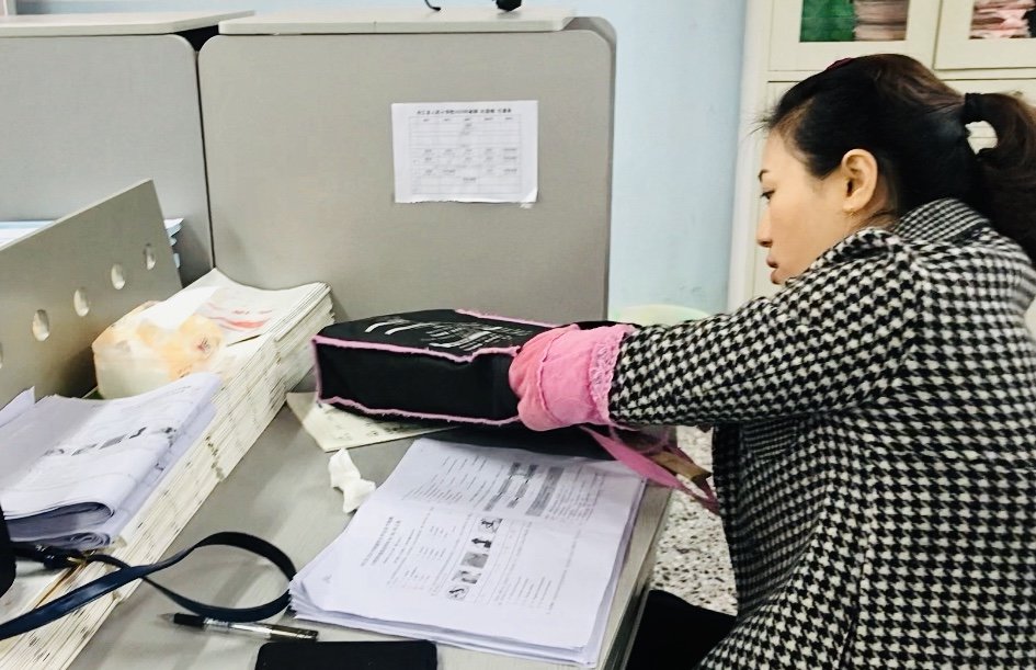 杜宣梅每天上课前,会在办公室将试卷、课本、备课本等准备好,放在袋子中拿到教室去。周梦颖 摄
