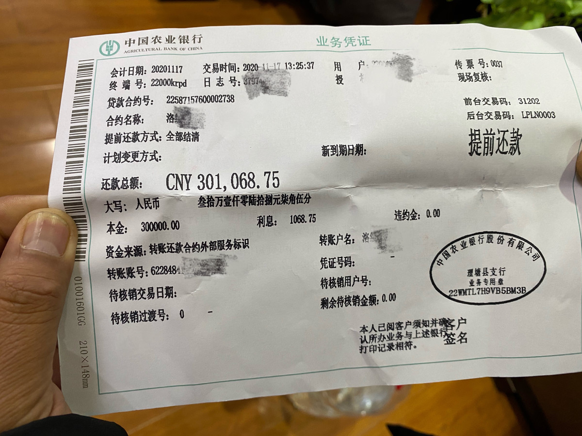 仅仅一天的时间,11月18日下午,老母亲背着沉甸甸的30万现金找到县农行工作人员,提前完成了还款。老母亲说:“虽然走不出儿子离世的痛苦,但不能让他离世还背负债务。这几年家里享受了低保等国家的很多惠民政策,更不能因为儿子的离世让国家财产蒙受损失。”农行负责人高度赞扬该母亲的做法,并代表单位和个人向老人表示慰问并送去了1000余元的慰问金。