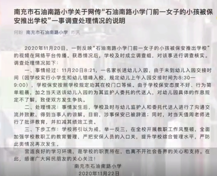 22日,南充市石油南路小学发文称,经学校调查核实,事发时,一名家长送幼儿入园,因未到幼儿入园交接时间(学校实行小学生和幼儿错峰入校,规定幼儿上午入园交接时间为8时30分至9时),学校保安按照学校规定劝其在校门口等候。因保安态度不好,行为简单粗暴,加之当天送孩子入园的为其监护人委托的代送人,对校方规定不了解,导致双方发生争执。事发后,学校及时与幼儿家长及委托代送人进行了沟通交流并致歉,得到当事人的谅解。