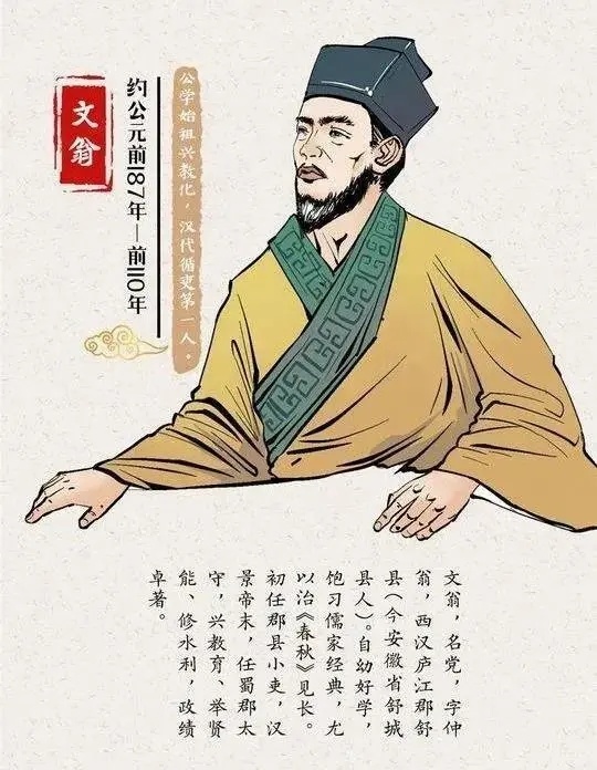 文翁(前187—前110),名党,字仲翁,西汉庐江舒人。公学始祖、“汉书循吏传第一人” 、第二批2020年四川省历史文化名人。文翁饱读诗书,“仁爱好教化”。他担任蜀郡太守期间,政绩卓著,其中有两件“为天下先”的大事,一是开蒲阳河,成为第一个扩大都江堰灌区的官员,二是在成都兴建蜀郡郡学,成为中国第一个创办地方政府官办学堂之人。文翁石室自西汉成立后,对巴蜀地区文化的教育发展和经济的繁荣起了重大的促进作用。开办数年,人文蔚起,蜀地得到大化,一跃成为全国科学文化先进地区之一,“蜀地学于京师者比齐鲁焉”。后世因此称之为“文翁化蜀”, 并将文翁创办学堂、与李冰兴建都江堰工程,视为四川两千多年来两项造福后人、功彪史册的不朽业绩。