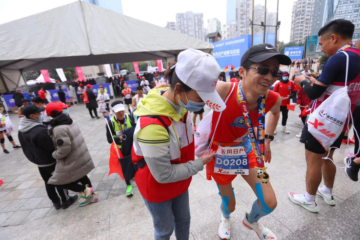 在赛道的终点,志愿者们早早等在了那里,随时准备着为完赛的选手们提供及时的补给。其中一名正在赛道终点清点物资的志愿者李长英告诉四川在线记者,她主要负责本次活动的完赛补给服务,这也是她第一次参加马拉松志愿服务。在外企从事管理工作的她,平时是一名跑步爱好者,十分关注体育类的活动。当被问到为什么要报名志愿者时,她说道:“我觉得做志愿者跟参赛不一样,不仅能够感受比赛的激情,还能在内心收获另一种满足。我希望成都的体育氛围和志愿服务氛围都越来越好,更希望自己也能在这中间出一份力。”
