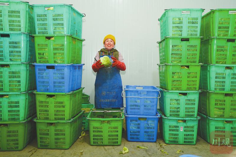 11月26日,木桠村村民策宝宝在冷链基地为生菜分拣装框。她在工厂务工一年能有2万元左右的收入。 向宇 摄